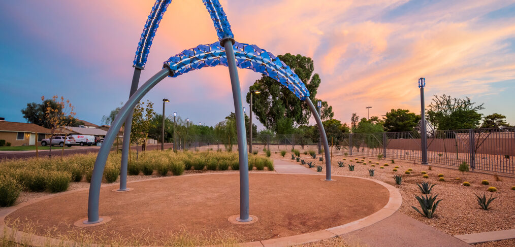 Dig Studio, the Phoenix Arts & Culture, and Phoenix Water Services transformed an inactive well site into a neighborhood beautification project with public art by Tempe artist, Bobby Zokaites. Zokaites created a set of sculptural arches that provides a low-maintenance, passive green space and transforms the abandoned site into a safe neighborhood amenity. The focal point of the space, artwork titled “A Time Machine Called Tinaja,” mimics the look and feel of water with glowing lights and cool blue panels.