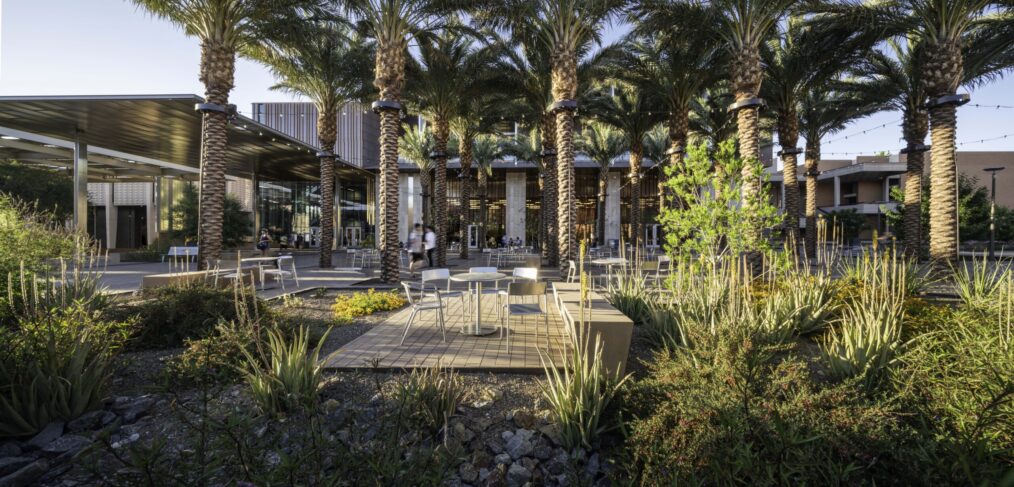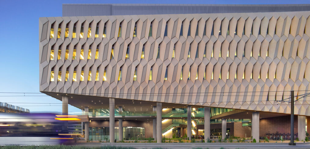 ASU’s Walton Center for Planetary Health offers a 281,000-square-foot home to leading-edge research focused on the sustainability of food, water, and energy. Half of the building is lifted off the site, providing cool breezes in the courtyard and shaded pedestrian links to the campus. The exterior self-shading shell strategy mimics the skin of a cactus, while the courtyard reveals how shade, color, wind, and water can be combined to create an inviting oasis.